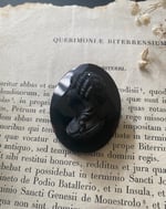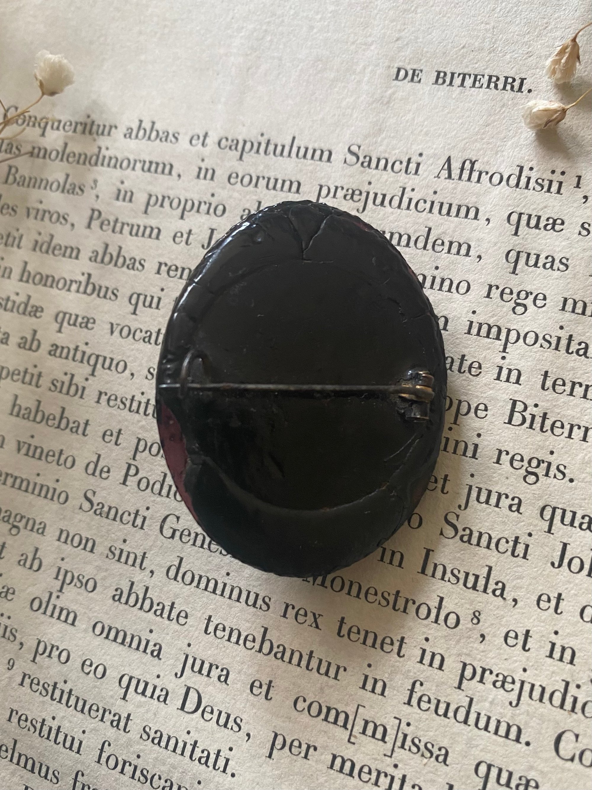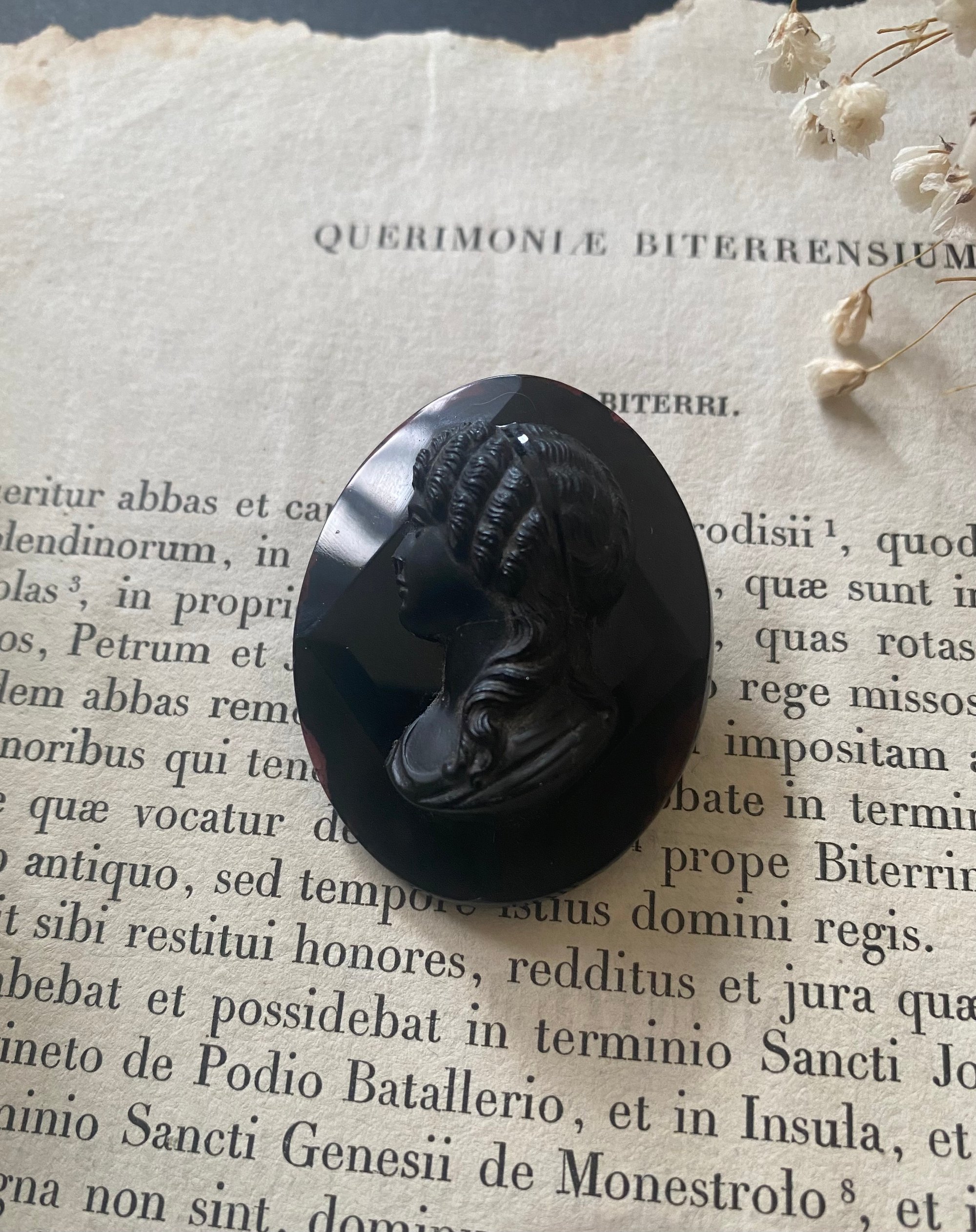 Camée, broche, bijou en pâte de verre violet sombre et ébonite, XIXème siècle.