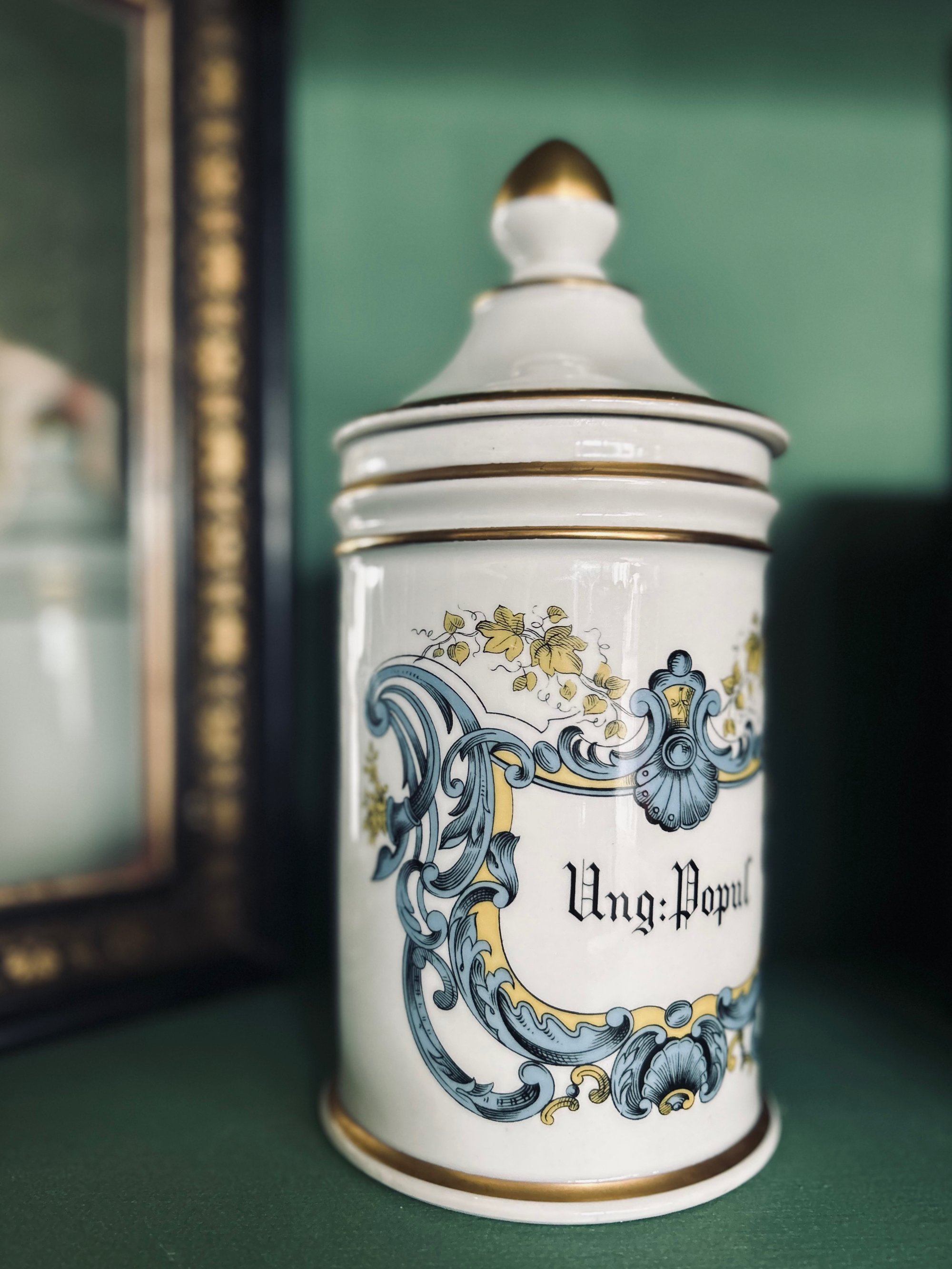 Grand pot d'apothicaire, porcelaine, inscription Ung.Popul. (onguent populéum)
