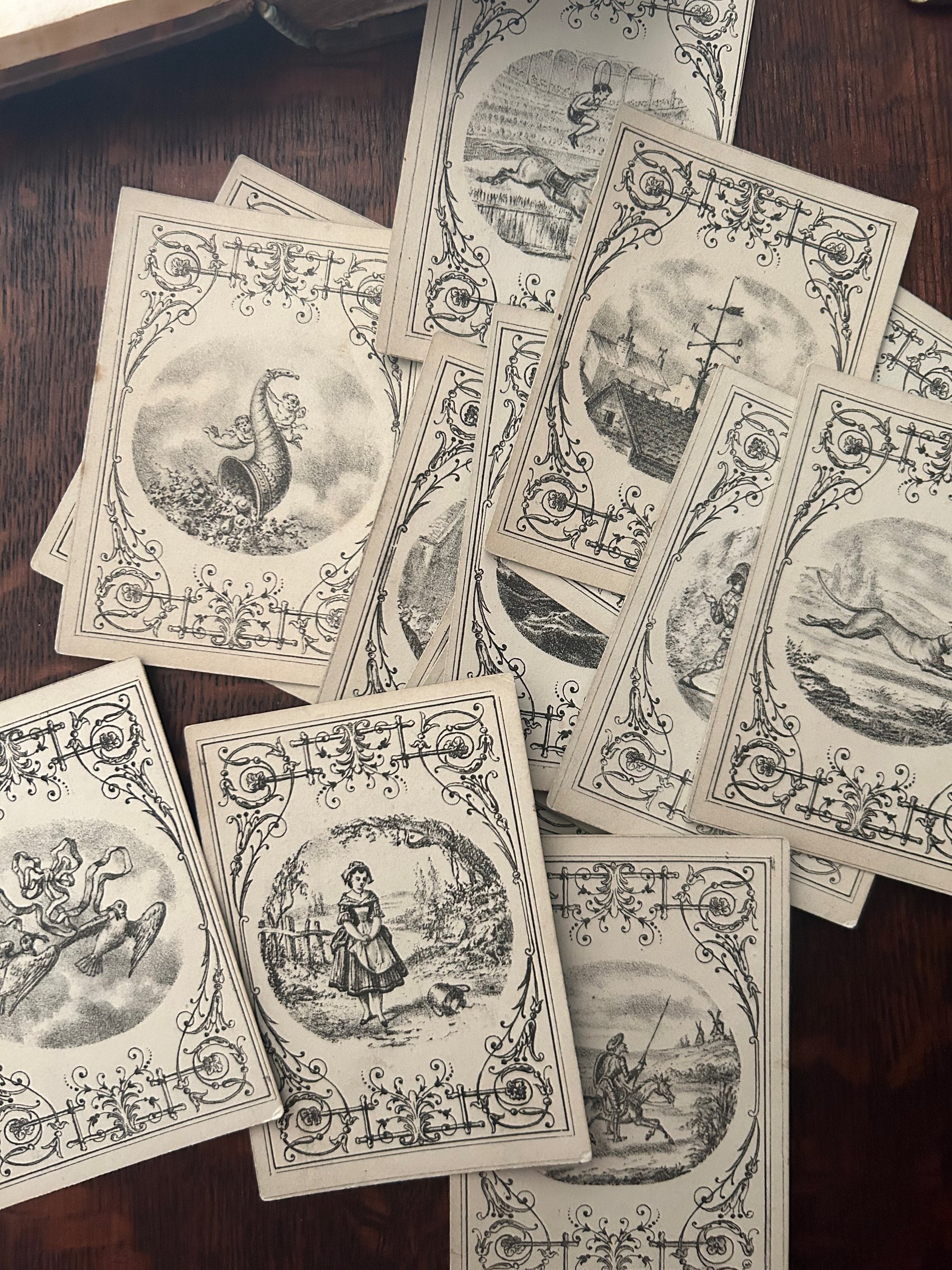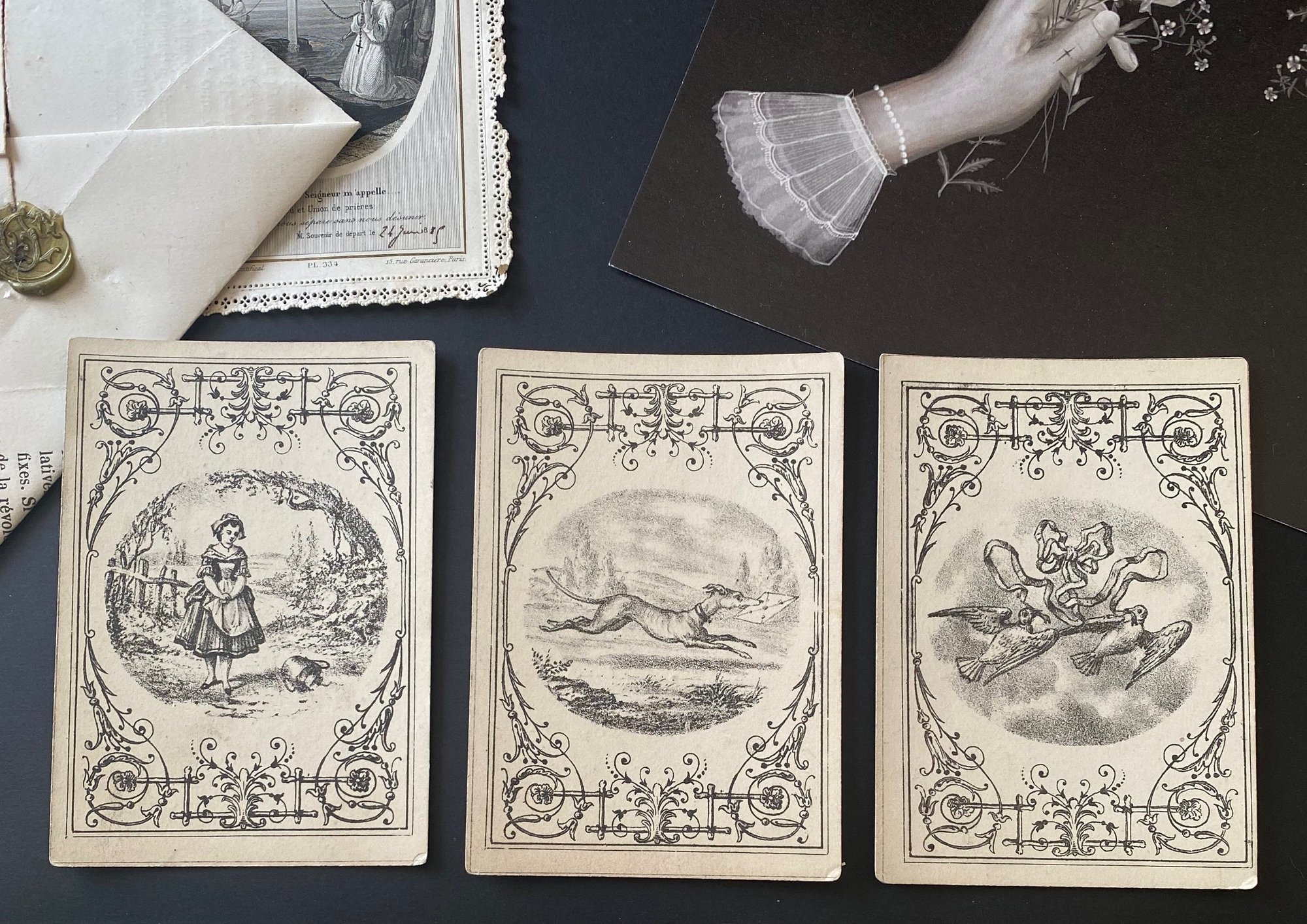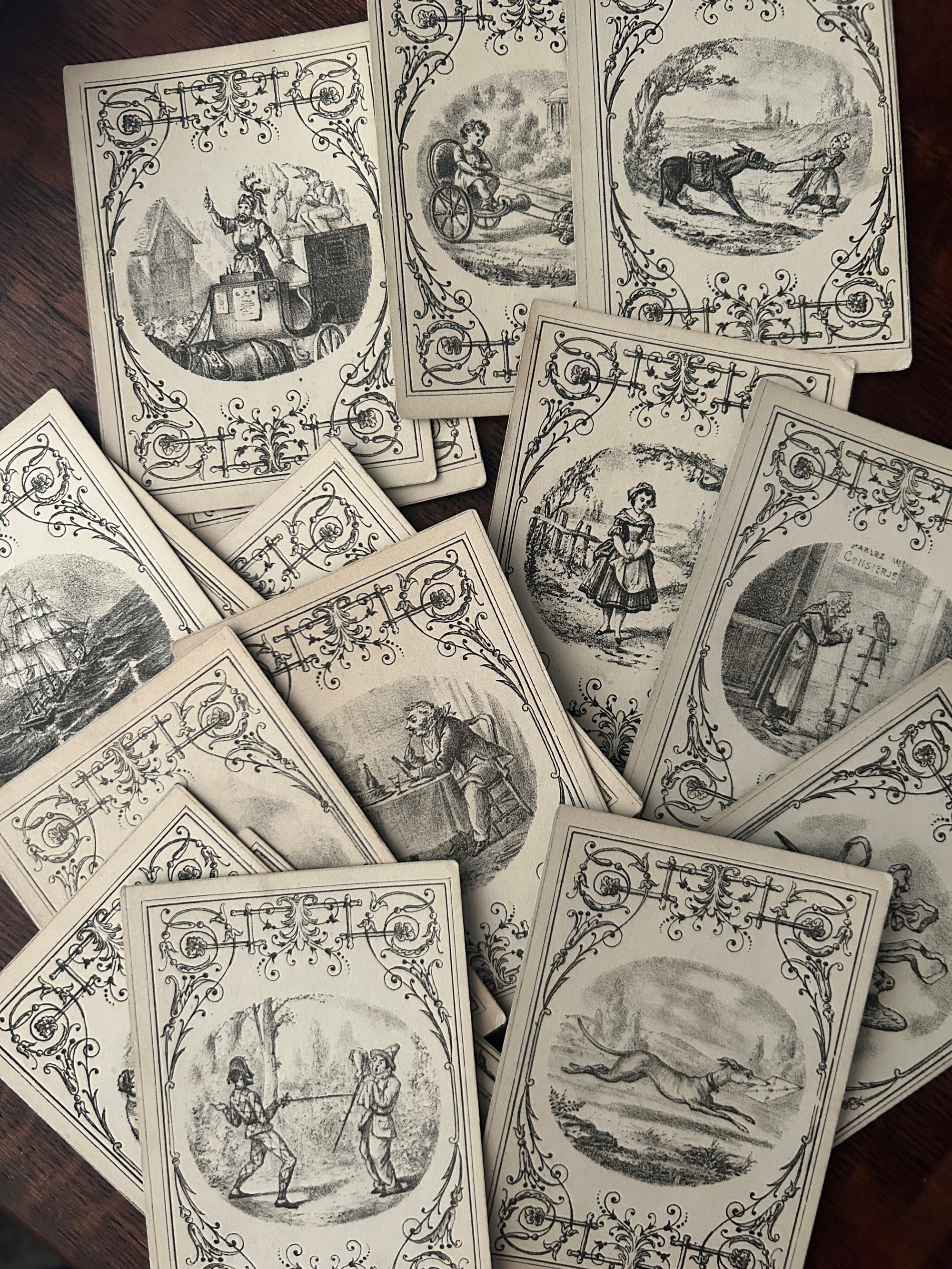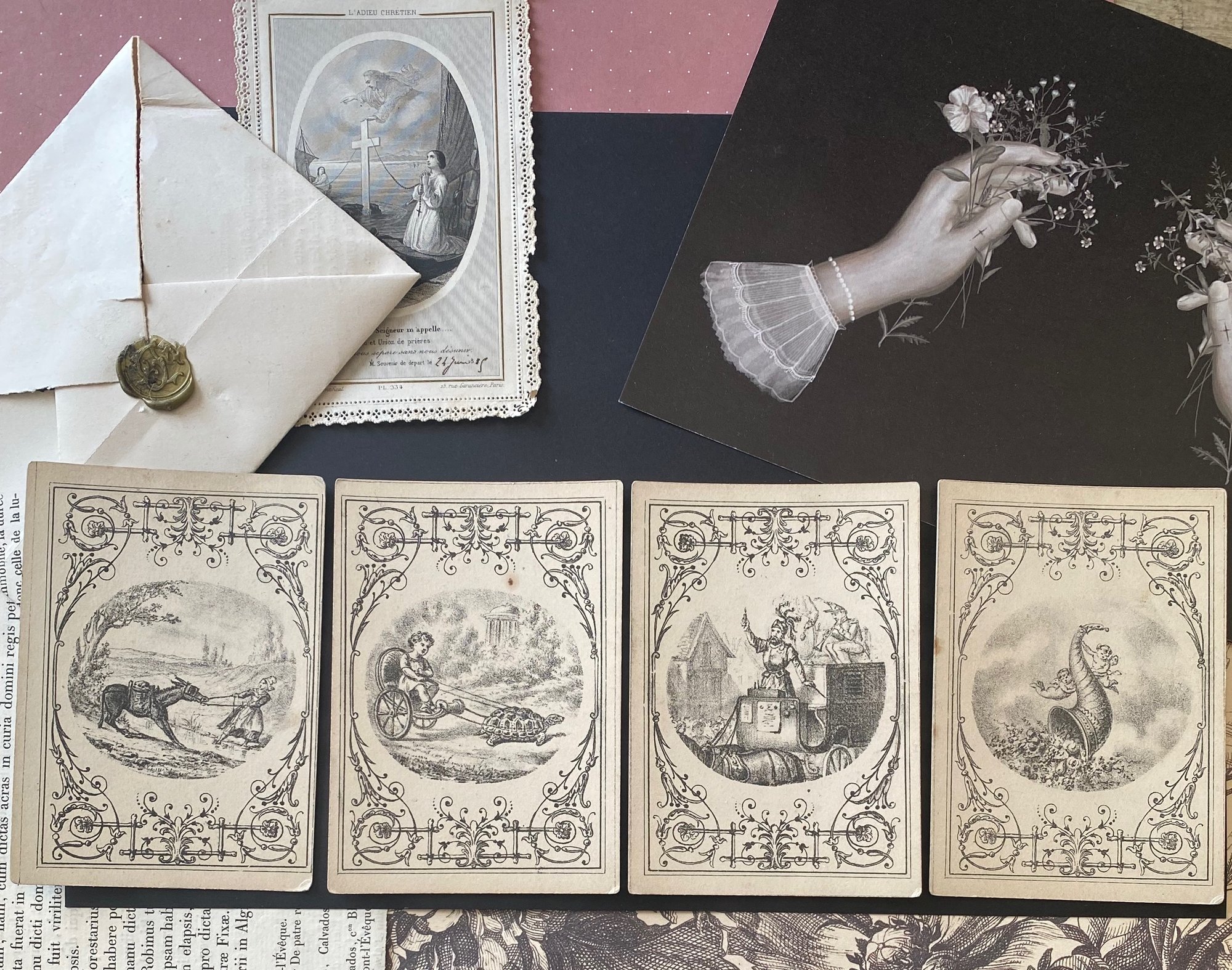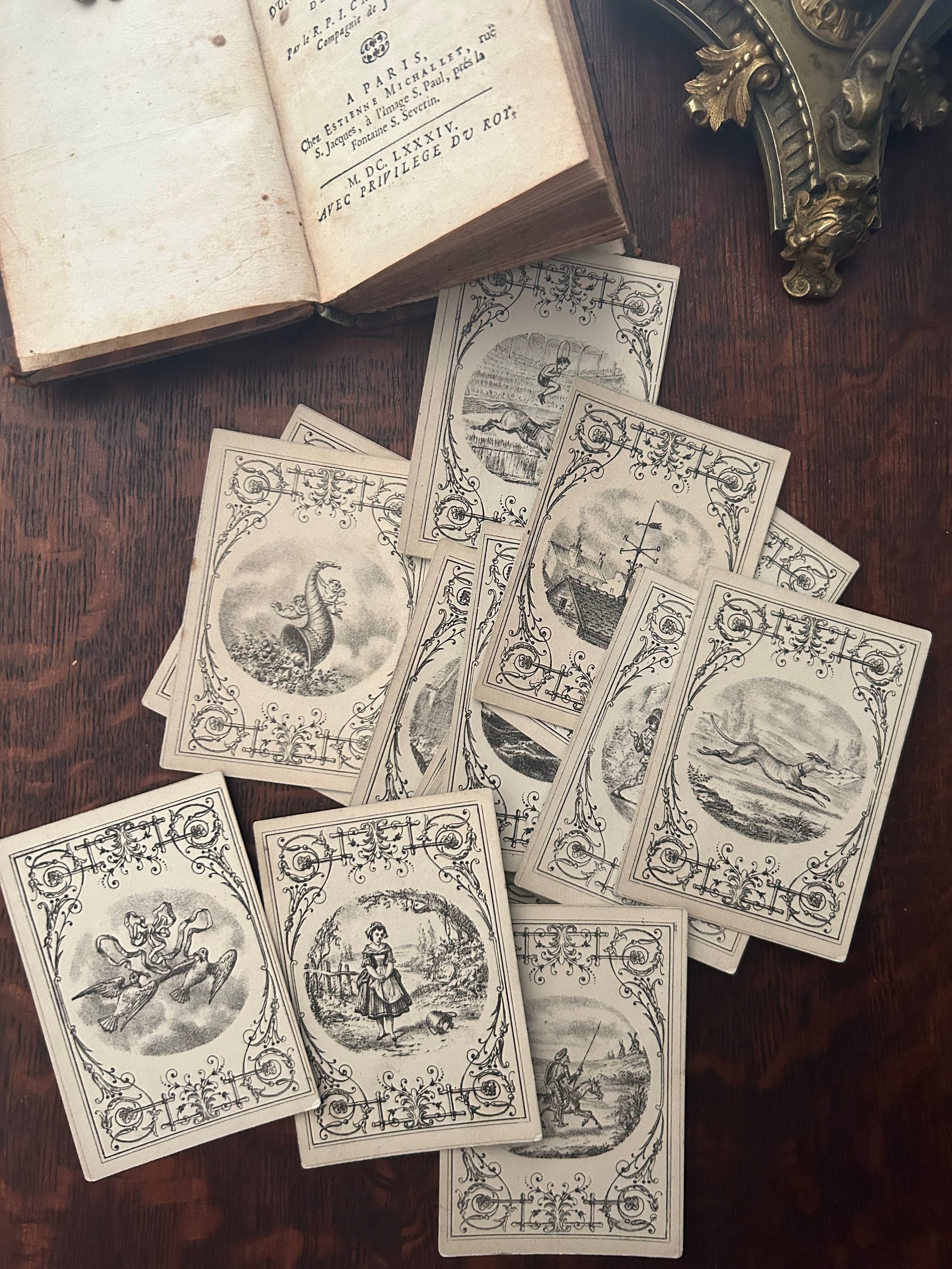 Extrêmement rare, 16 cartes du jeu divinatoire de l'Oracle Symbolique de Wattillaux, du XIXème siècle.