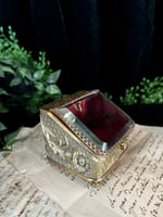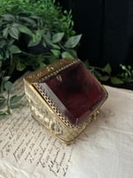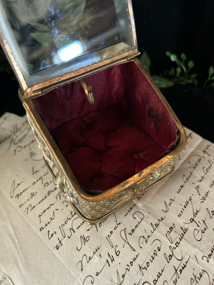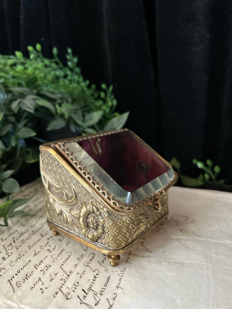 Magnifique boite à bijoux en verre et laiton et soie capitonnée rouge. XIXème s.