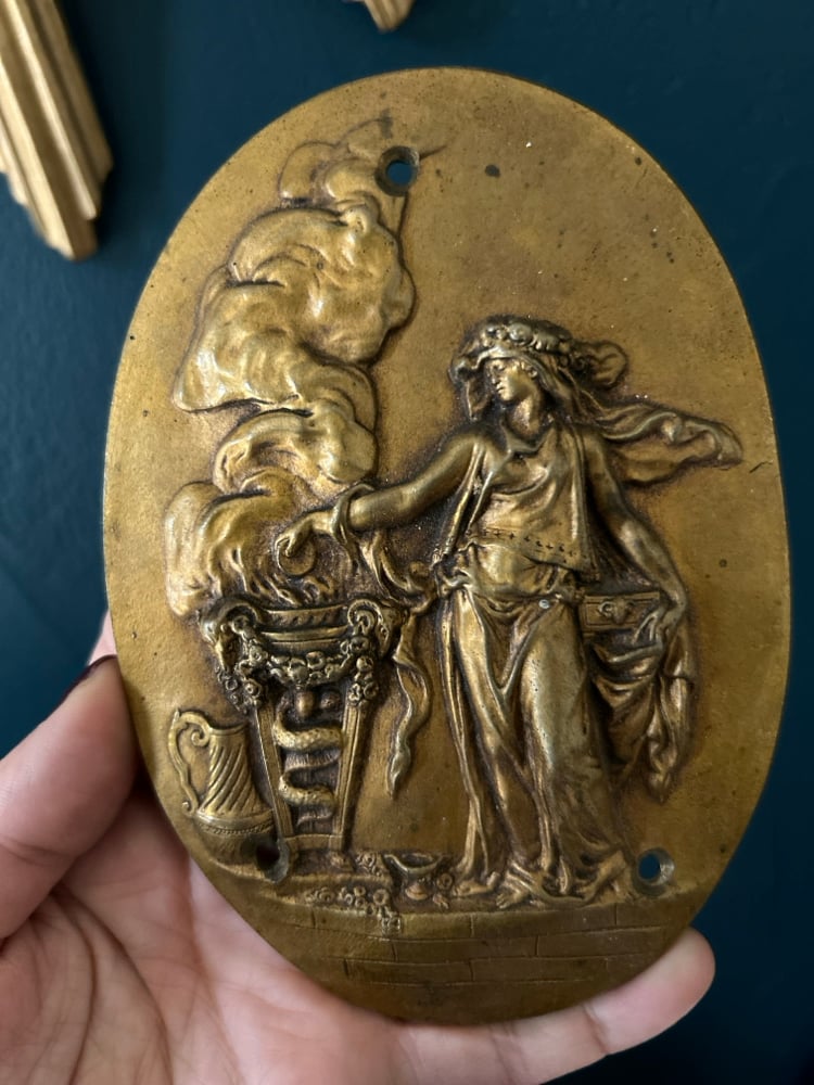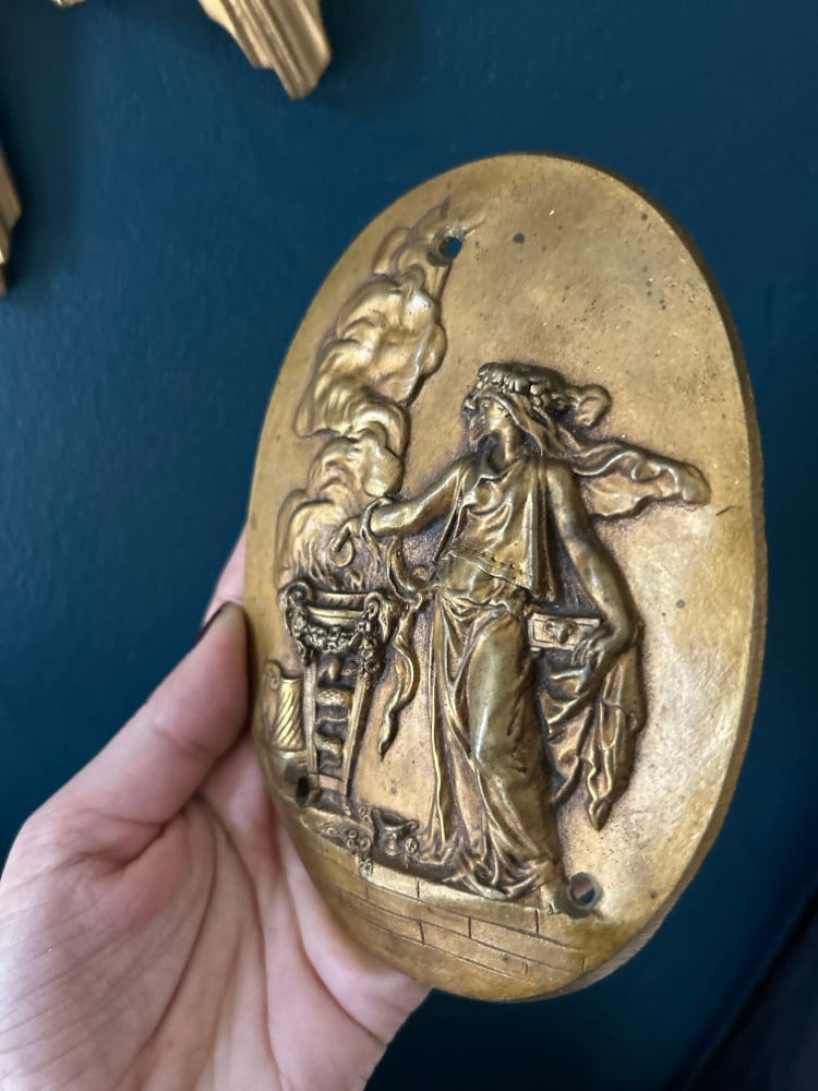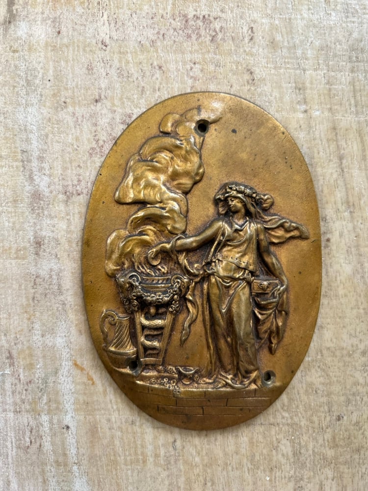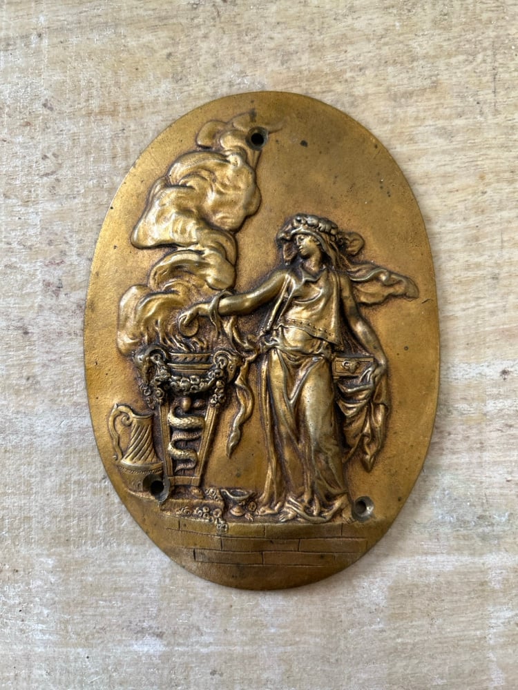 Médaillon en bronze massif représentant une prêtresse versant de l’encens sur un trépied, il s’agit d’une interprétation romantique de l’œuvre de Joseph Marie Vien, peinte en 1762, pour représenter l’hiver.
