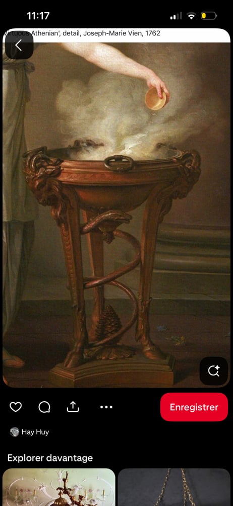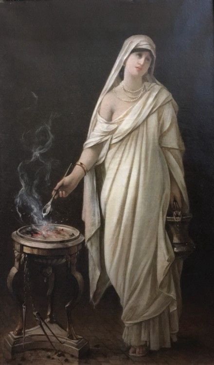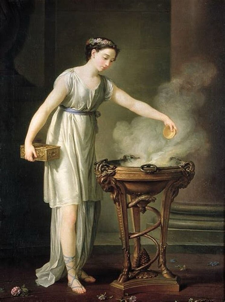 Tout d’abord simplement décrite comme « une prêtresse brûlé de l’encens sur un trépied » dans la catalogue de 1763.
