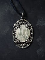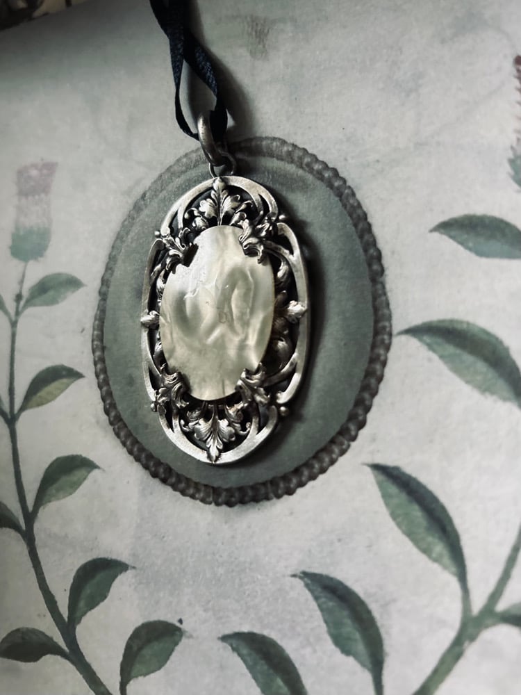 Magnifique pendentif métal plaqué argent, rond de nacre et feuille d’acanthes, XIXème siecle