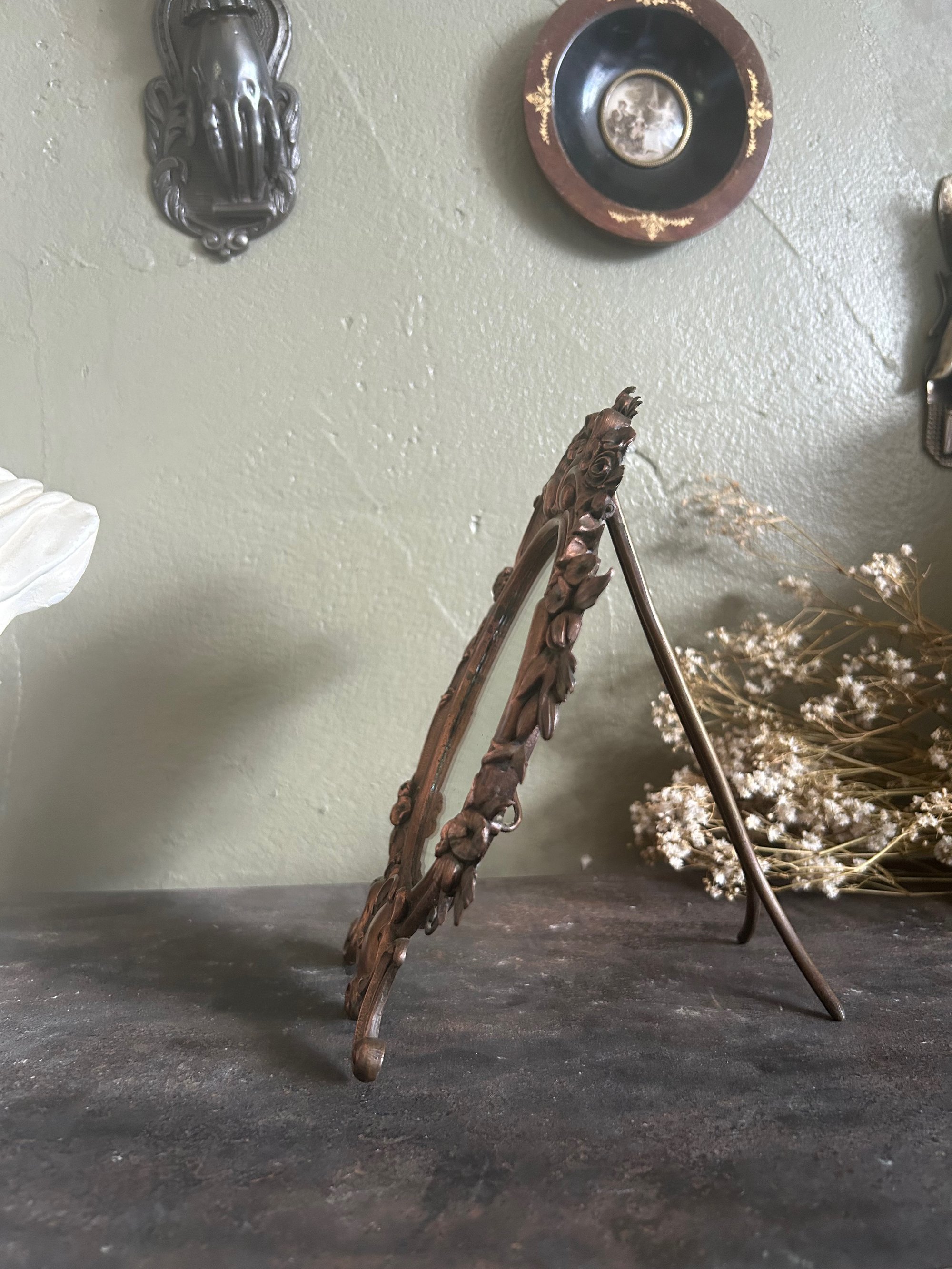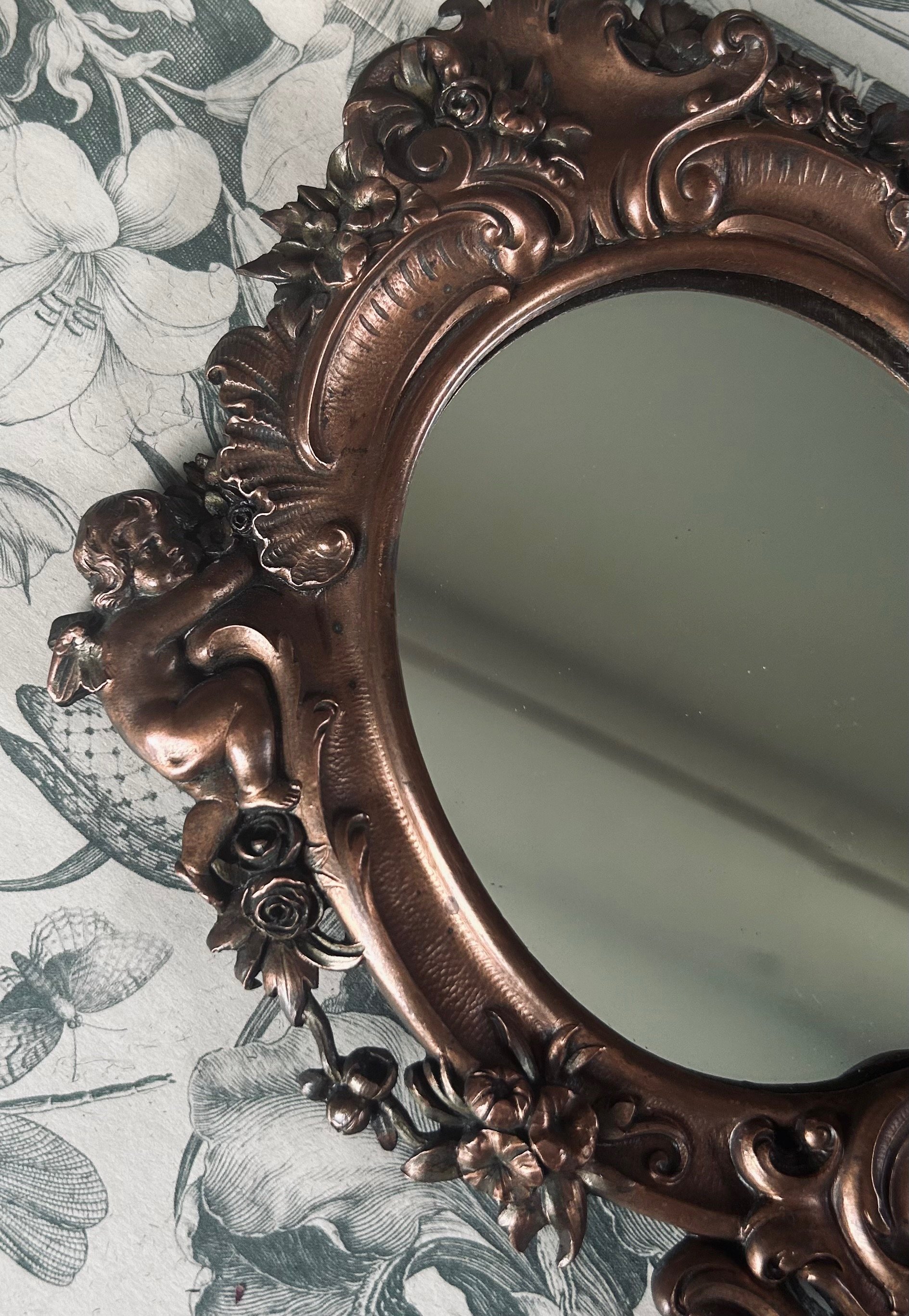 Miroir de toilette, en cuivre, à décor de putti et de roses, époque Napoleon III, style roccocco!