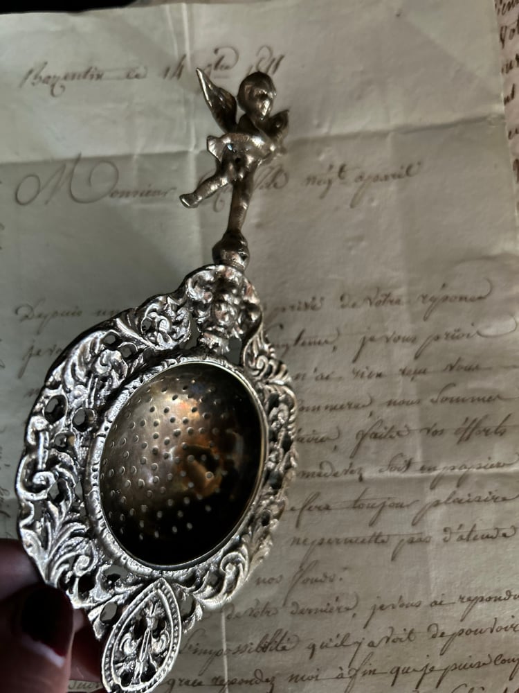 Magnifique passe-thé en bronze plaqué argent de très bonne qualité, décor d’ange