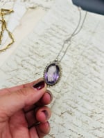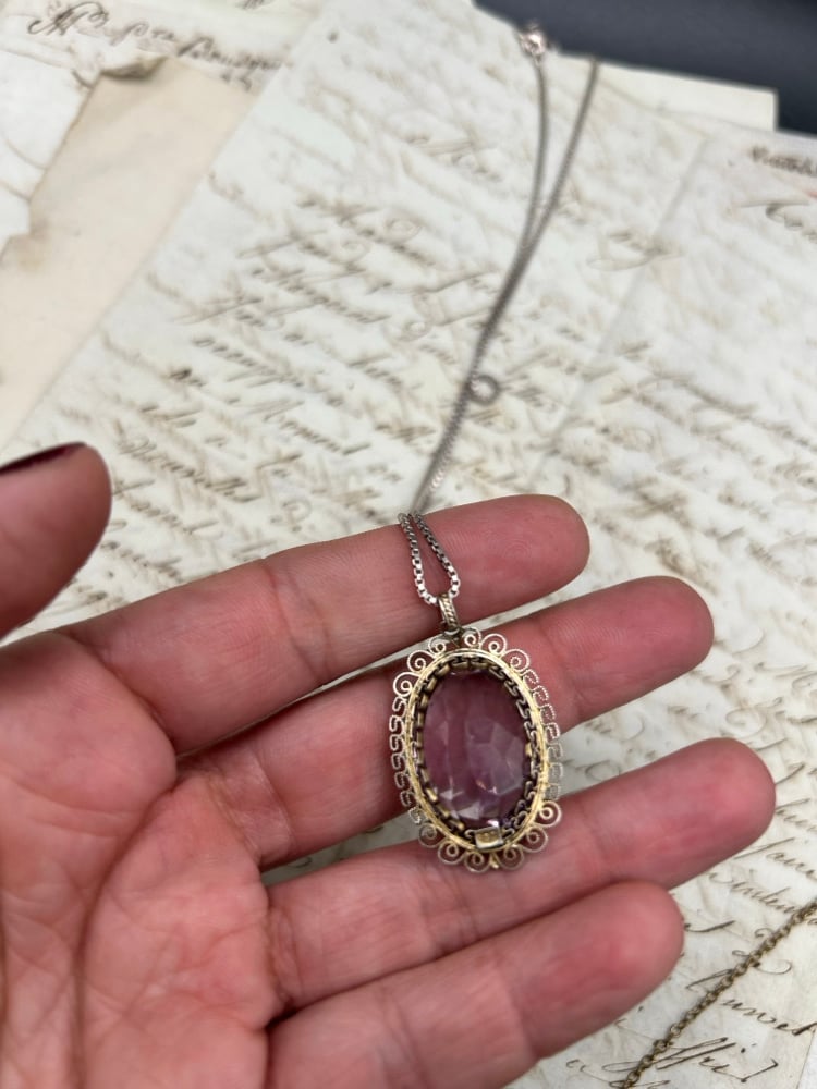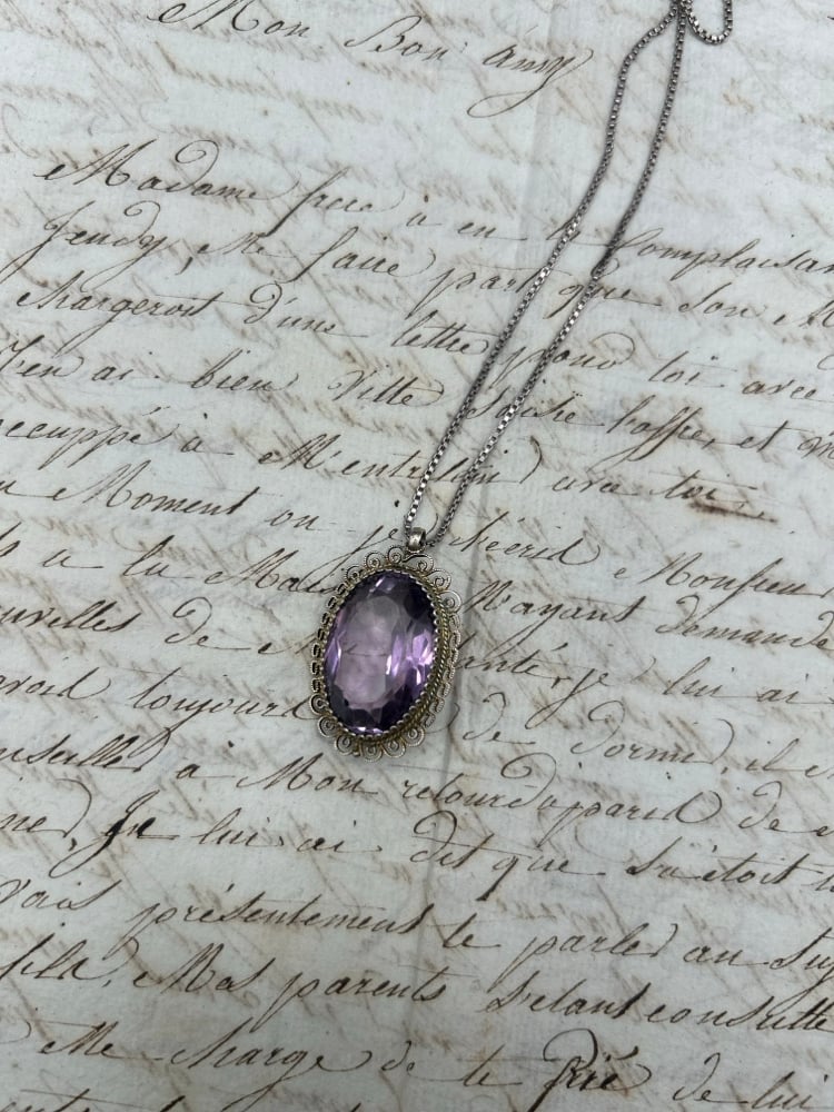 Incroyable pendentif en améthyste naturelle, facetée et d’une très belle couleur! Serti en argent massif filigrané plaqué or poinçonné (la dorure est effacée sur la majeure partie)