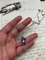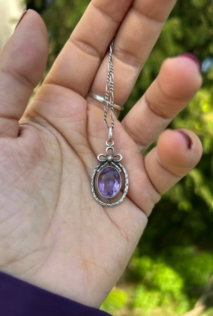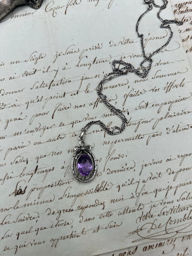 Superbe pendentif en argent massif, améthyste et perle, avec chaîne, époque Art Déco, 1910-30