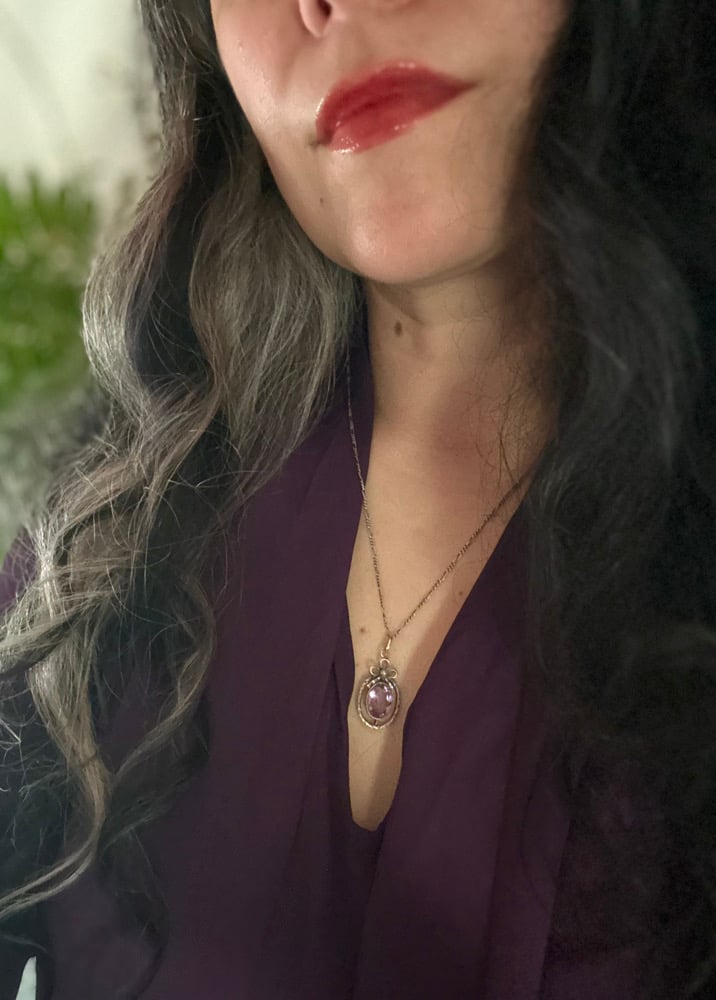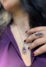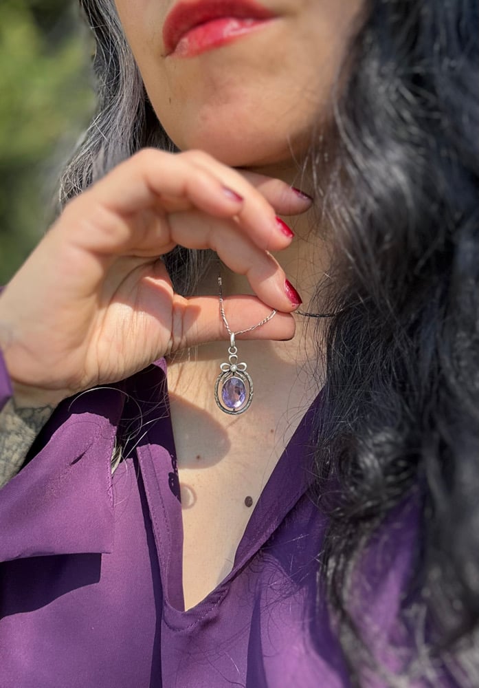 Incroyable pendentif en améthyste naturelle, facetée et d’une très belle couleur! Mintire en argent massif avec un motif de ruban et perle synthétique.